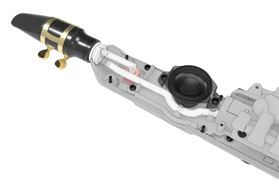 Уникальная система Integrated Bell Acoustic System компании Yamaha позволяет воспользоваться и преимуществами высококачественного цифрового звука, и превосходной выразительностью акустического духового инструмента. Эта инновационная система, которая состоит из динамиков, корпусов, акустической трубки и настоящего латунного раструба, реагирует на то, как вы дуете в мундштук, и воспроизводит через динамики соответствующий цифровой звук, вызывающий резонанс и вибрации в раструбе. Точнее, от звука резонирует весь корпус, и вы ощущаете эти вибрации губами через мундштук и кончиками пальцев через клапаны. В результате инструмент словно оживает, вибрируя во время игры, чтобы вы ощущали выразительность акустического саксофона, пользуясь широкими возможностями цифрового инструмента.