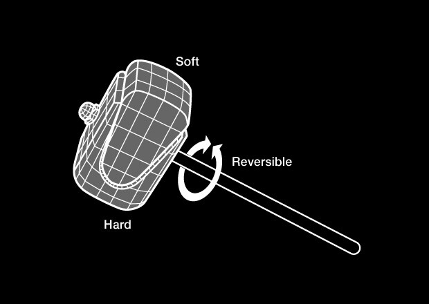 The two-way beater offers two ways to play. Instead of simply attaching plastic to the felt, the plastic is wrapped around a large mass of felt delivering greater playability with the felt side.