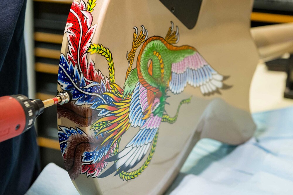 «Я предложил кое-какие идеи с тиграми и злыми японскими масками, но в итоге решил использовать дракона и феникса», — поясняет свой выбор Хиро. «Логотип Yamaha напоминает мне о фениксе, который является идеальной темой для моих новых отношений с компанией, и отражает наше общее японское наследие».