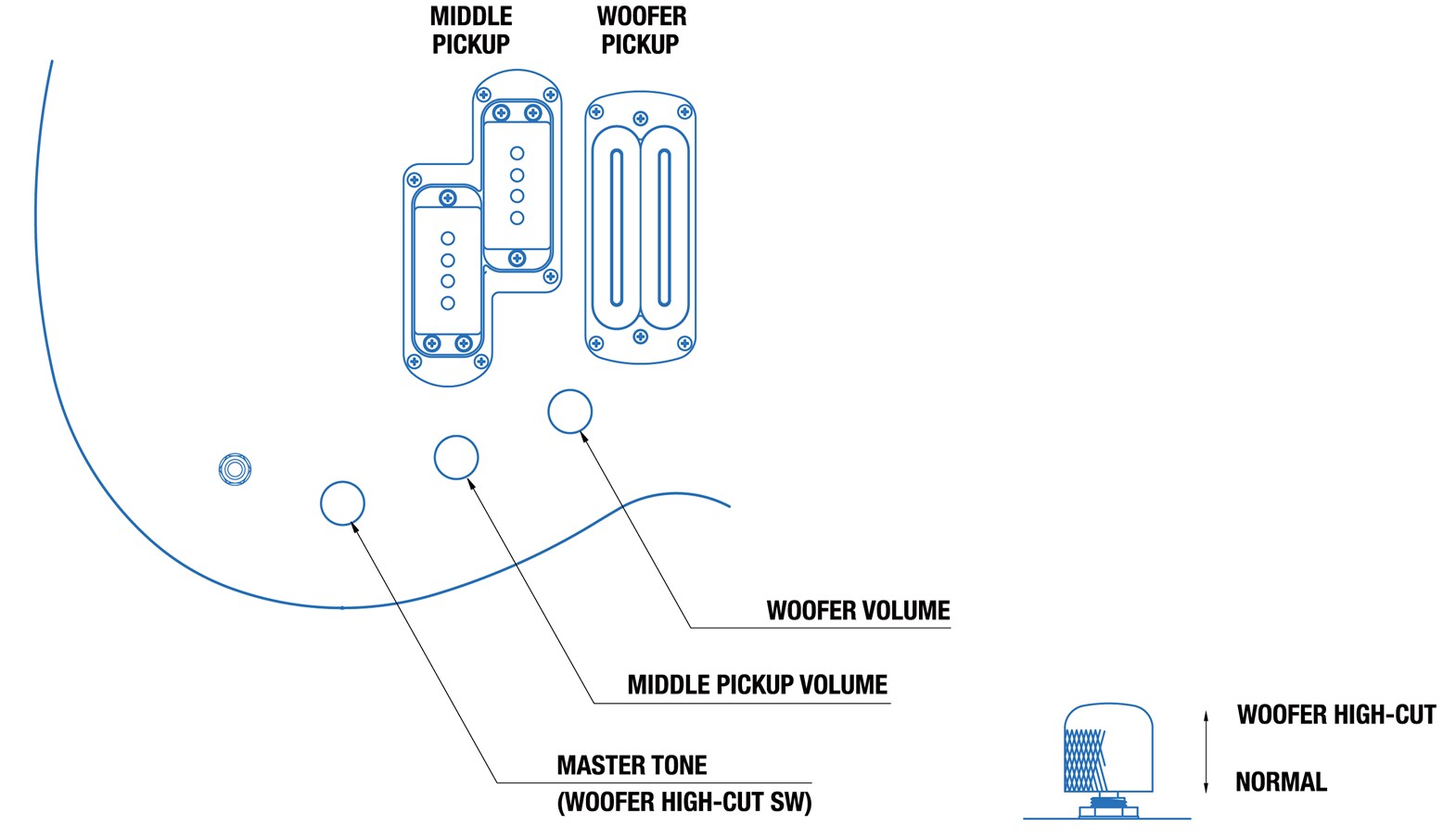 | Регуляторы | Woofer P.U. Volume, Middle P.U. Volume, Master Tone with Woofer P.U. High Cut Switch | ||