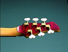 Яркие белые перламутровые колки на конце удлиненного грифа помогают в создании законченного образа инструмента.
