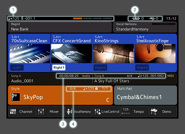 1. Такт/доля/темп: текущее положение (такт/доля/темп) при воспроизведении в режиме «Стиль» или «MIDI-композиция».