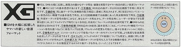 Covering a vast array of voice and effect parameters, the XG format sets forth requirements for both tone generator and data. As such, any MIDI data based on this format and played using a compatible tone generator would produce music almost identical to that on the original instrument, even to the level of subtle nuances. In addition, data produced on high-quality, advanced models could be played without any problems on lower-end synths, making the XG format highly popular with a wide range of different users. Our first synthesizer to support this new format was the MU80 of 1994.