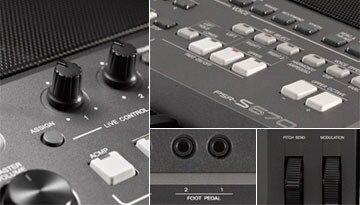 Модель PSR-S670 имеет колесо модуляции, два назначаемых контроллера и два входа для ножных переключателей, что позволяет управлять тембрами, стилями и эффектами в режиме реального времени.