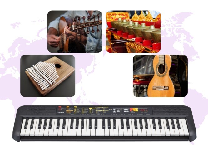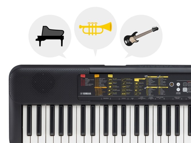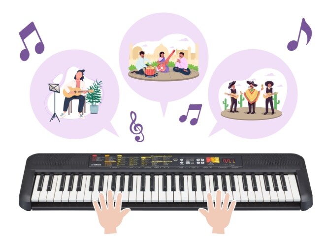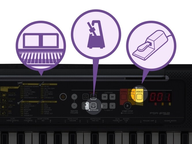 Кроме гитары, пианино и духовых инструментов, Yamaha PSR-F52 умеет воспроизводить и звуки инструментов (тембры), которые являются необходимыми для исполнения музыки в различных регионах мира. Функция автоматического аккомпанемента в разных стилях позволяет почувствовать себя в составе музыкальной группы. Функция автоаккомпанемента поддерживает множество стилей, куда входят не только стандартные стили типа рока или джаза, но и особые стили, передающие весь местный колорит музыки разных стран.