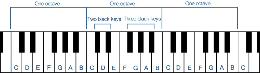 Как показано на схеме, раскладка фортепианной клавиатуры состоит из чередующихся в определённом порядке белых и чёрных клавиш. При нажатии клавиши звучит определённая нота. На схеме белые клавиши обозначены их названиями музыкального алфавита.
