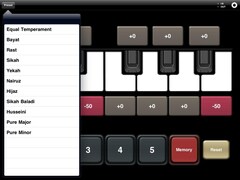 Имеется возможность выбора нужного лада: равномерно темперированный, натуральный (мажор и минор) и восемь стандартных арабских строев.