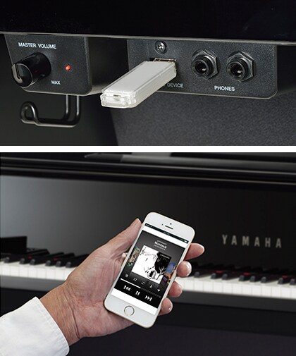 К разъему USB to Device можно подключить USB-накопитель и использовать его в качестве встроенной студии для записи фортепианных выступлений. Выступления можно сохранять напрямую на USB-накопитель в виде аудиокомпозиций. Эти композиции хранятся в формате WAV, поэтому их можно как прослушать на встроенной акустической системе фортепиано, так и воспроизвести на компьютере, передать на портативный проигрыватель или загрузить в Интернет, чтобы поделиться с друзьями.