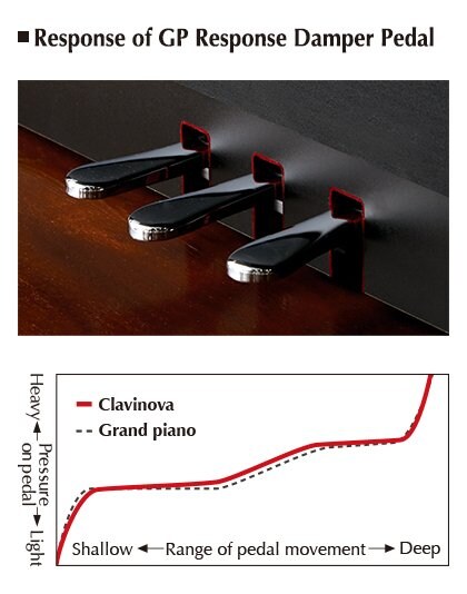 Топовые модели оснащены педалью GP Response Damper с кривой сопротивления, как у рояля: вначале нажатие осуществляется легко, а чем дальше, тем большее усилие надо прилагать. Это помогает исполнителю привыкнуть к нюансировке с использованием педали.