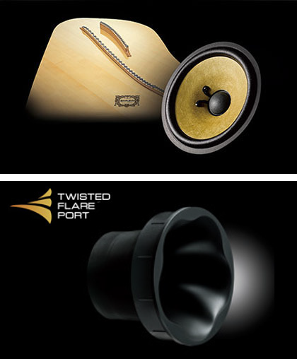 Twisted Flare Port, новая технология компании Yamaha, позволяет получить более чистый бас. Порт фазоинвертора в форме слегка скрученного рупора сглаживает проходящий поток воздуха. По сравнению с обычным портом он уменьшает шум от воздушных завихрений, что способствует четкому и точному воспроизведению низких частот.