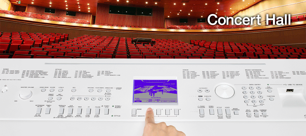 Функция Piano Room в DGX-660 позволяет вам расположить выбранное вами фортепиано в одном из множества помещений и настроить акустические свойства таким образом, чтобы атмосфера соответствовала вашим предпочтениям во время практики или во время выступления. Просто выберите инструмент, пространство и настройте степень открытия крышки деки.