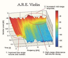 The graph shows how the A.R.E. treatment results in the characteristic changes given below.1. Improving the low range volume and sustain delivers a stronger fundamental tone with better projection.2. Increased mid-range response delivers richer tone and more expressive power.3. High range dissonance has a shorter decay improving instrument response and articulation.Our research team, which has many years experience studying woods for instruments, started the A.R.E project in the 1990s with the goal of using this technology on our violins. Before we brought it to the violin, it was utilized first on guitars, and for acoustic building materials used in concert halls where it has been proven to deliver significant improvements in the product’s performance. We are pleased that we can now use this technology on the instrument that it was originally intended for, and take great pride in presenting the YVN500S, the flagship of the Artida series.