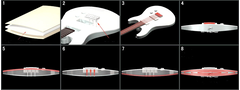 - Верхний пласт дерева быстро реагирует на вибрацию струн, которая передается через бридж. Специальные звуковые трубки, проходящие через корпус, обеспечивают резонанс в материале середины корпуса. Задняя часть корпуса резонирует, приводя в резонанс весь корпус полностью, за счет чего достигается глубина и мощь тембра. (3)-(8)
