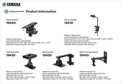 Основанная в 1949 году, компания König & Meyer является ведущим мировым производителем стоек для микрофонов, акустических систем и музыкальных инструментов, предлагая широкий ассортимент высококачественных и прочных крепежей для кронштейнов и стоек, полностью совместимых с оборудованием Yamaha.